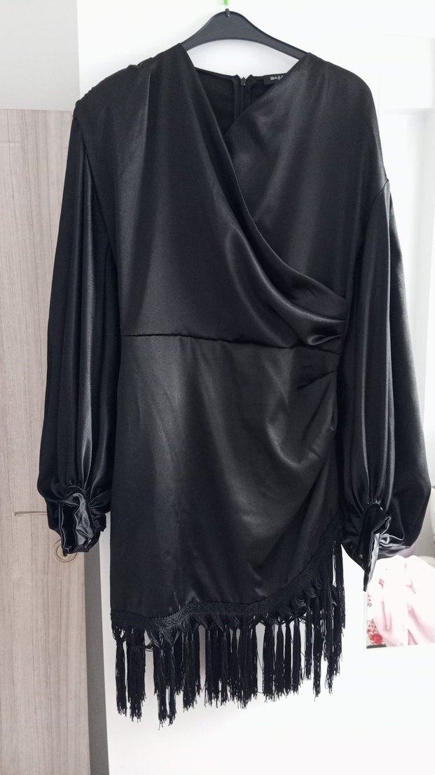 Bu siyah uzun kollu süet abiye elbise, drapeli yapısı, yüksek yakası ve bol kesimi ile dikkat çeker. Desenli detayları ve püsküllü etek ucu gotik tarzı yansıtır.