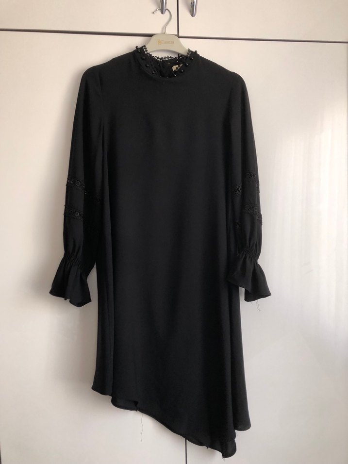 Yüksek yakalı, bol kesim, uzun kollu siyah tunik. İpek gibi kumaştan, fırfır ve nakış detaylarına sahip, klasik zarafet ve gotik tarzı yansıtır.