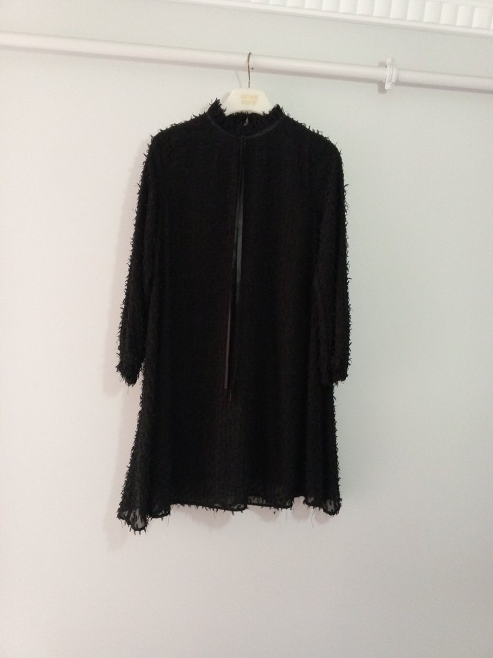 Uzun kollu, yüksek yakalı siyah keten tunik, püskül detaylı ve bol kesim ile gotik tarzda.