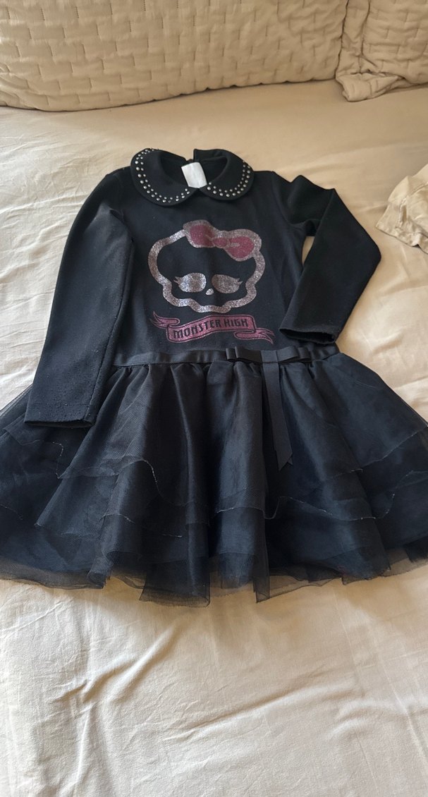 Uzun kollu, siyah gotik tarzda, baskılı kafatası desenli, fırfırlı etekli ve perçinli yakalı, sentetik kumaştan yapılmış dar kesim elbise.