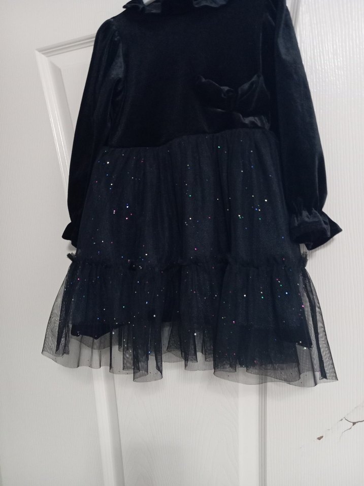 Uzun kollu, yüksek yakalı ve etek kısmında hafif ışıltılı fırfır detaylı siyah kız elbisesi. Yumuşak sentetik kumaştan üretilmiştir.