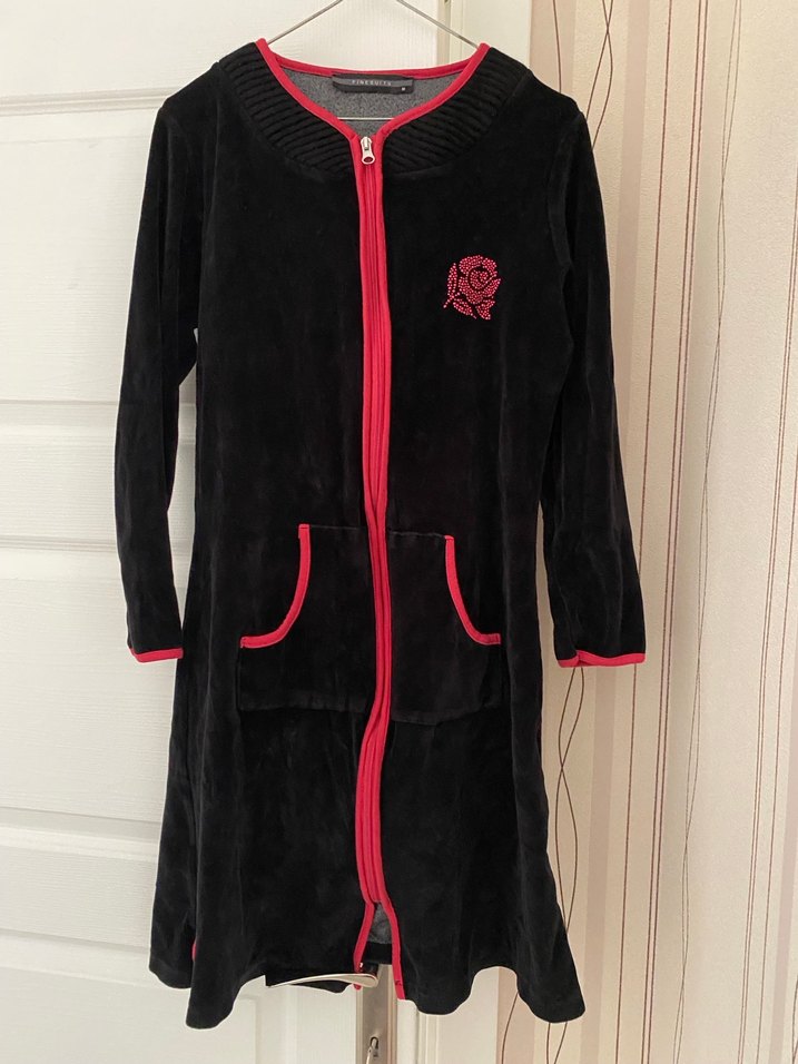 Bu siyah, uzun kollu, fitted midi elbise, kırmızı fermuar detayları ve göğüste gül baskılı kadife sabahlık
