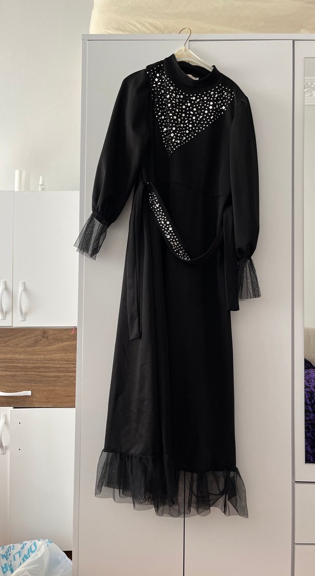 Uzun kollu, yüksek yakalı siyah gotik abiye elbise, nakış işlemeli ve drapeli detaylara sahiptir. Düz kesimdir ve düğün için uygundur. Hafif defolu bazı taşları düşmüş 40-42-44 uyumlu