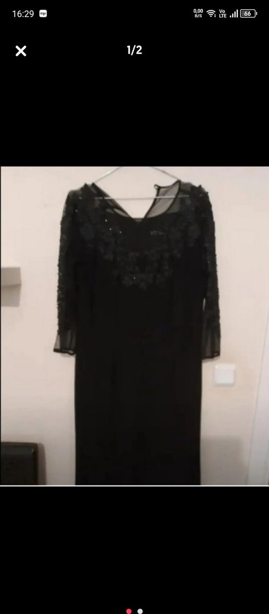 V yaka, uzun kollu ve nakışlı payet detaylı siyah, vücuda oturan gotik tarzda uzun abiye elbise. Avant-garde ve düğün için uygun.