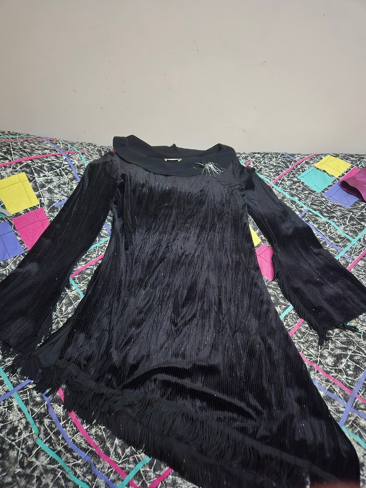 Uzun kollu, tekne yaka siyah gece bluzu, pileli kumaş ve bol kesim ile gotik desen sunar. Parti için uygundur.