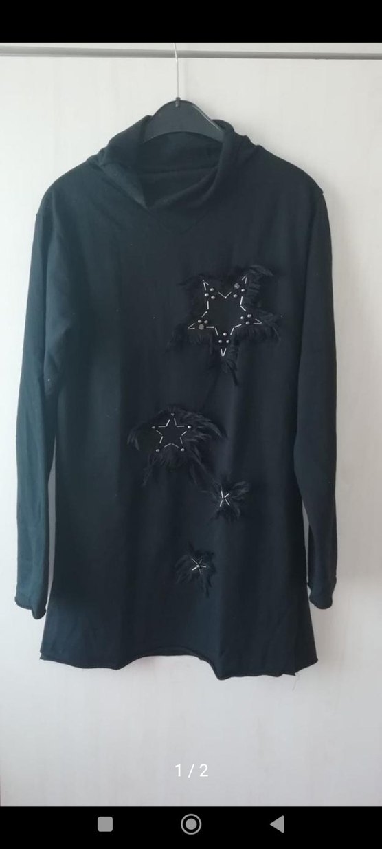Uzun kollu, siyah, boğazlı ve bol kesim tunik. Pul işlemeli ve nakışlı yıldız desenleriyle gotik tarzda, sentetik kumaştan üretilmiştir.