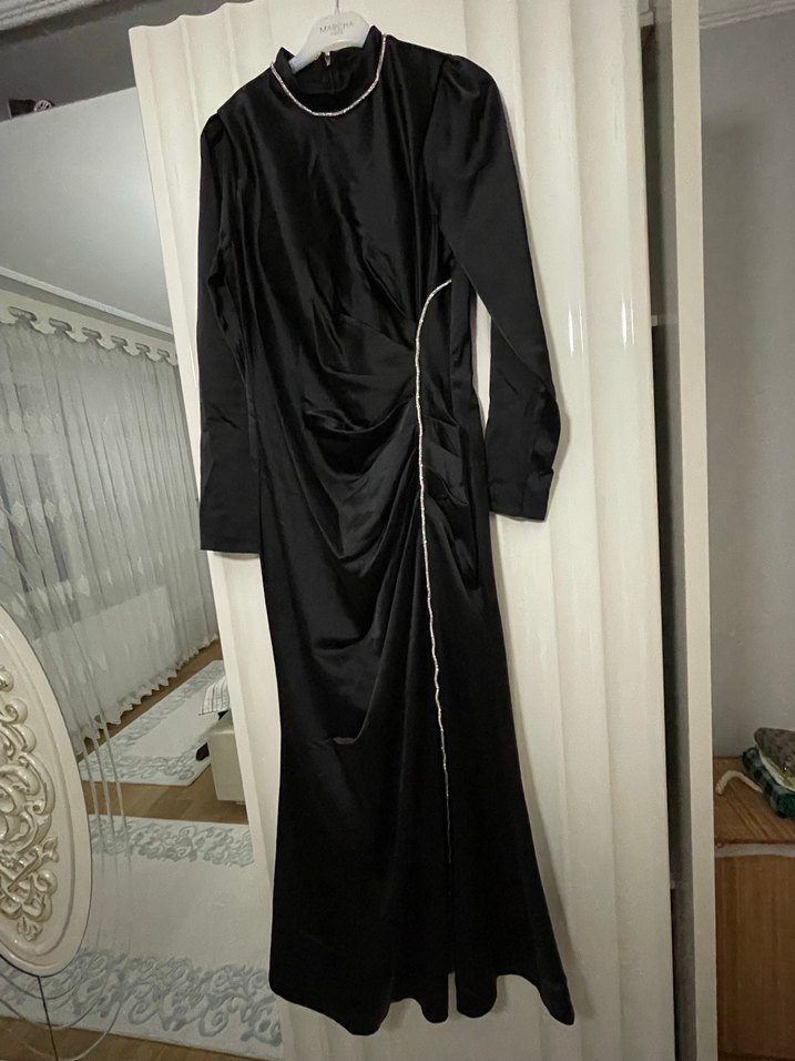 Bu siyah uzun abiye elbise, uzun kollu, yüksek yakalı ve drapeli detaylara sahip, klasik gotik şıklığı yansıtıyor.