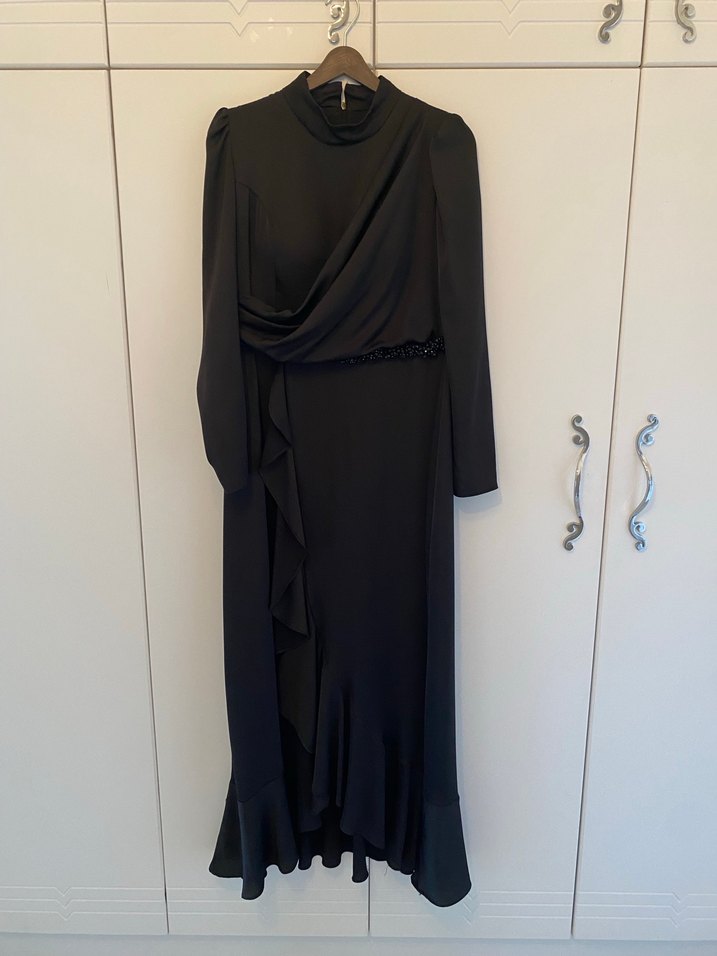 Yüksek yakalı, uzun kollu ve drapeli siyah gotik tarzda uzun elbise. Ofis için uygun, düzenli kesim ve sade tasarıma sahip.