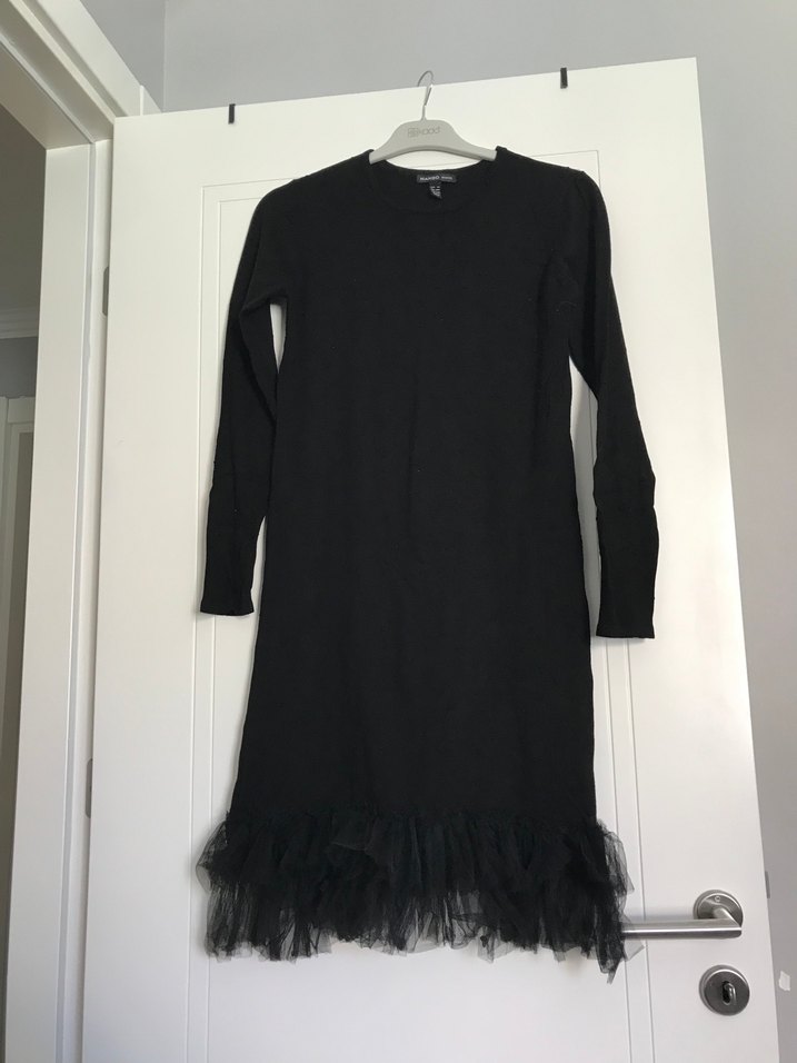 Uzun kollu, bisiklet yaka ve etek ucu fırfırlı siyah, dar kesim uzun elbise. Sentetik kumaştan, gotik tarzda günlük kullanım için uygundur.