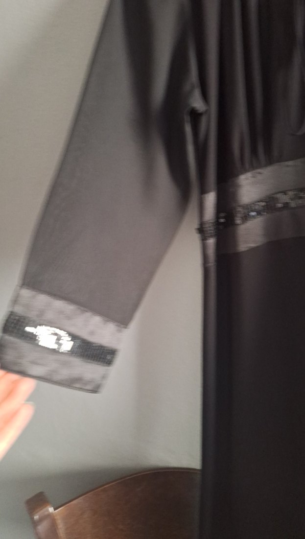 Siyah uzun elbise, uzun kollu ve V yakalıdır. Etek kısmında yırtmaç ve manşetlerde parlak detaylar bulunur. Gotik tarzda, günlük kullanıma uygundur.