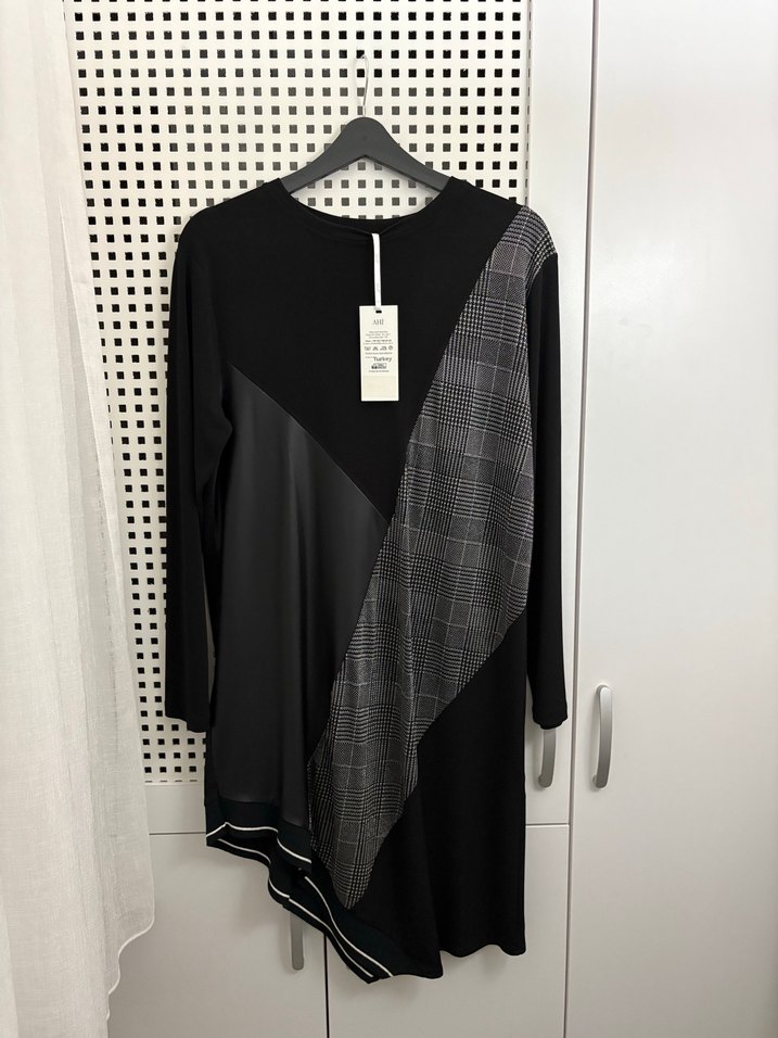 Uzun kollu, bisiklet yaka ve regular fit olan bu tunik; siyah sentetik kumaş ile gri baskılı, drapeli bir paneli birleştirir, sokak stiline uygundur. Yeni etiketlidir 52x100cm öiçülerindedir