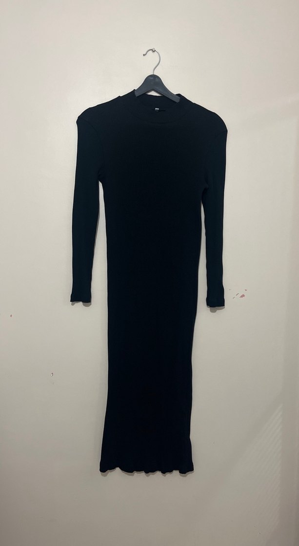 Bu siyah uzun elbise, uzun kollu ve bisiklet yaka olup, ince kesimi ve düz tasarımıyla minimalist gotik tarz sunar. Günlük kullanıma uygundur.