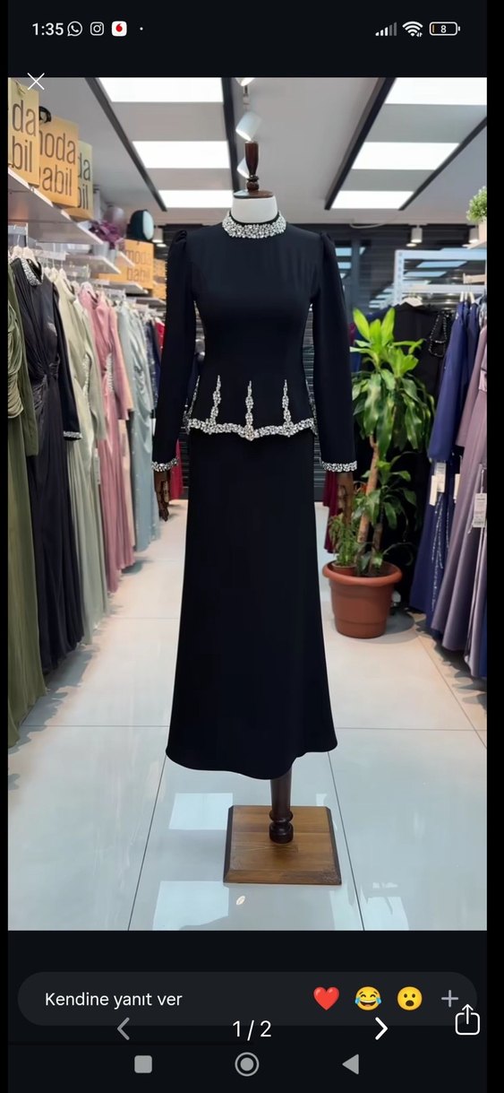 Uzun kollu, yüksek yakalı siyah abiye elbise, işlemeli ve boncuk detaylı. Klasik kesimli, ofis kullanımı için uygun.