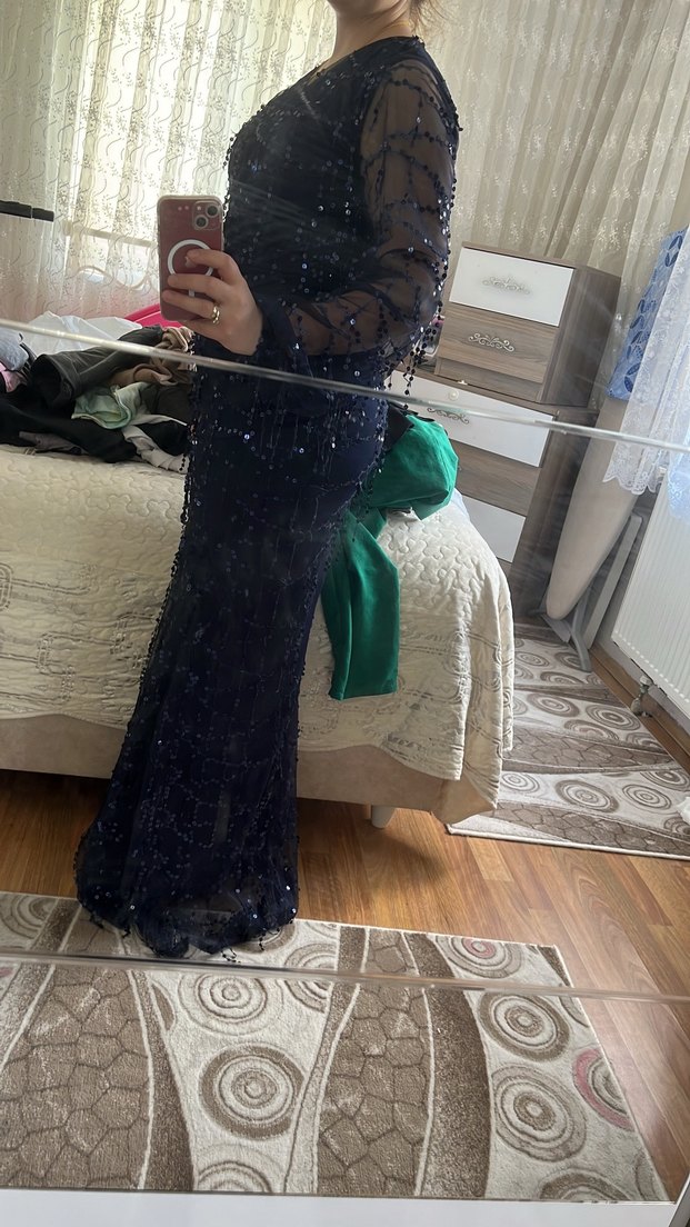 Uzun kollu, işlemeli detaylara sahip, drapeli ve V yakalı siyah abiye elbisedir. Fitted kesimi ve koyu rengiyle gotik ve şık bir görünüm sunar.