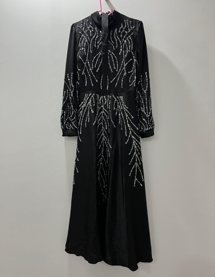 Uzun kollu, yüksek yakalı siyah abiye elbise, işlemeli ve payet detaylarıyla avant-garde goth tarzında, rahat kesimdir. şal da mevcuttur
