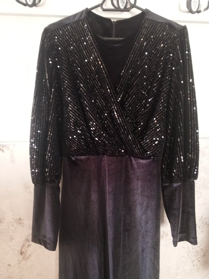 Fitted kesim siyah abiye elbise, uzun kollu ve V yaka, drapeli ve işlemeli detaylara sahip. Partiler için uygun, gösterişli gotik tarzda. kadife bir elbise