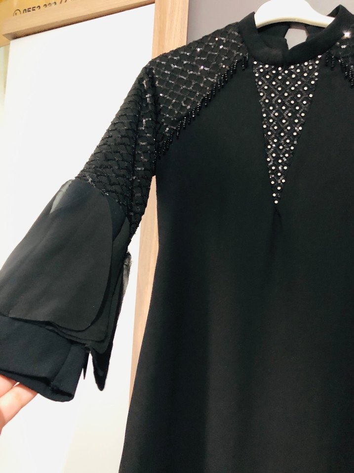 Yüksek yakalı, uzun kollu siyah gotik takım .Nakışlı ve payet detaylarıyla parlak bir görünüm sunar.