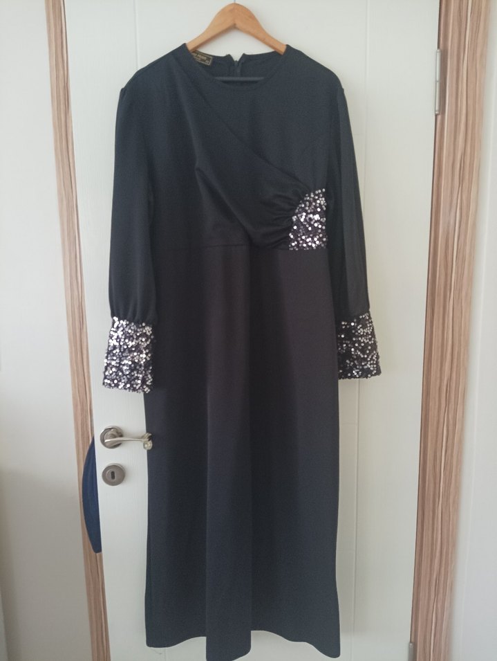 Uzun boy siyah abiye elbise, bel ve kollarında payet detayları ile drapeli tasarıma sahiptir. V yaka ve uzun kolludur, mütevazı ve rahat kesimlidir.