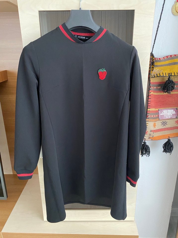 Kırmızı çizgili bisiklet yaka, uzun kollu, düğmeli manşetli, küçük çilek baskılı siyah midi uzunluğunda dar kesim tunik.