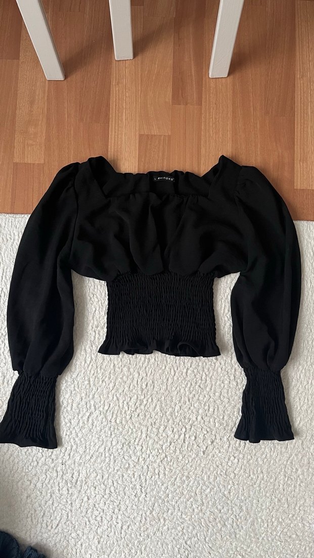 Uzun kollu, tek renk siyah bluz, tekne yakalı ve fırfır detaylı. Keten kumaştan, beli lastikli ve tarzda günlük kullanıma uygun.