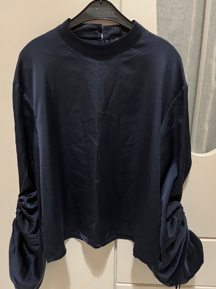 Kadınlar için uzun kollu, drapeli ve yüksek yakalı siyah bluz. İpek gibi kumaştan, bol kesim ve normal midi boyda, günlük sokak stili için uygundur.