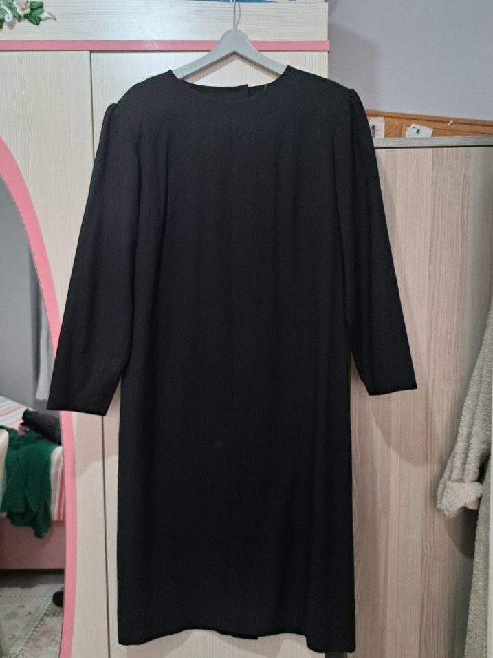 Uzun kollu, regular fit siyah kadın elbise, minimalist ve gotik tarzda, desensiz sade görünüme sahiptir. defosu var