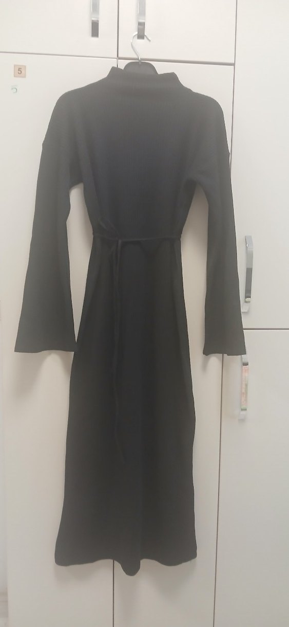 Siyah uzun elbise, uzun kollu ve yüksek yakalı, beli kuşaklı ve vücuda oturan kesime sahip, sentetik kumaştan üretilmiştir.