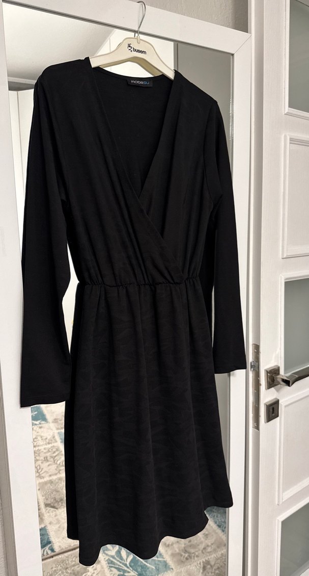 Bu siyah, uzun kollu ve vücuda oturan elbise, minimalist ve gotik tarzda olup desensizdir.