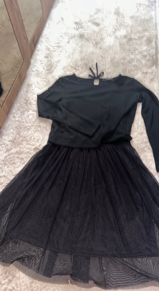 Uzun kollu, bol kesim siyah abiye elbise, tek düze ve fırfırlı detaylı etek katmanlarıyla hem günlük hem parti tarzına uygundur. Hamile elbisesi aşırı tatlı duruyor normalde de giyilebilir yepyeni 1 kez kullandım