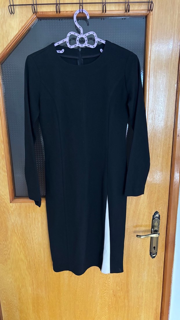 Uzun kollu, siyah kadın ofis elbisesi, regular fit ve yırtmaç detayına sahiptir. Notlu yaka ve düz dokulu sentetik kumaştan üretilmiştir.