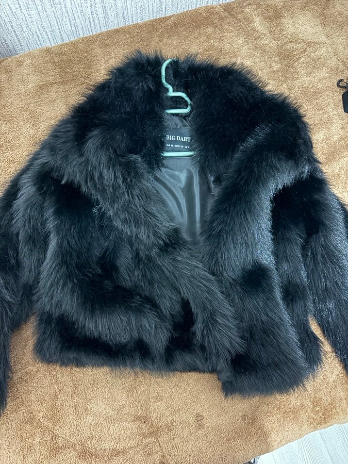 Uzun kollu, siyah taklit kürk ceket, kesimi vücuda oturur, günlük kullanım için sıcak ve şık bir görünüm sunar.