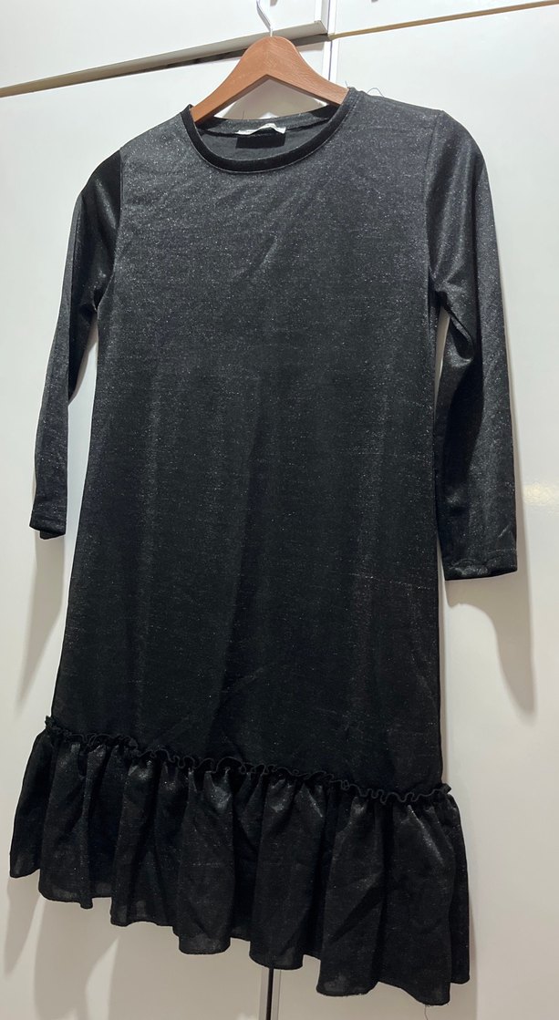 Uzun kollu, yuvarlak yaka, bol kesim siyah triko elbise. Etek kısmında fırfır detayı bulunur, gotik tarzda gündelik kullanıma uygun. Not: astarı yok , simli ve kemerle çok daha iyi duruyor