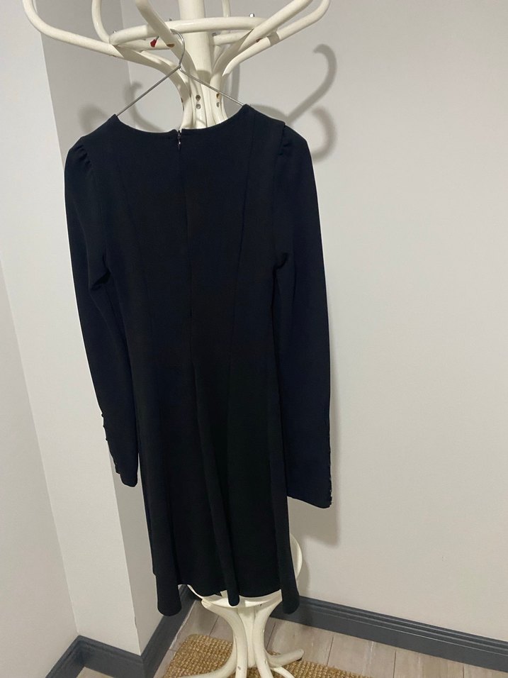 Dar kesim siyah elbise, yuvarlak yaka ve uzun kollu, düğme detaylarıyla ofis için şık ve gotik tarzda.
