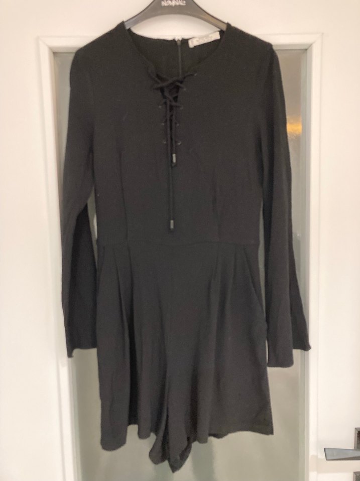 Siyah renkli, uzun kollu ve V yakalı kadın tulumu, bağcıklı detay ve kemer ile tamamlanmıştır. Sentetik kumaştan üretilmiş, romantik akşamlar için uygundur. Ölçüleri mevcuttur