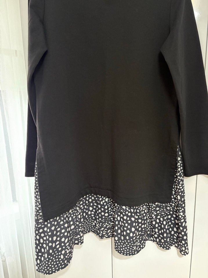 Uzun kollu, bol kesim siyah kadın tunik, baskılı ve fırfırlı etek ucu detayına sahip. Sentetik kumaştan, günlük kullanıma uygun minimalist tarzda.
