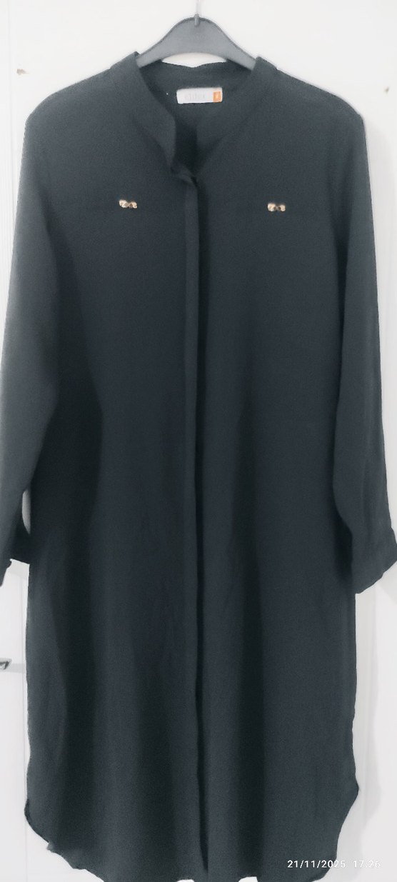 2 Adet tunik 42-44 beden ideal Uzun kollu, siyah renkte ve bol kesim olan bu kadın uzun elbise, minimalist gotik tarzını yansıtır. Desensiz ve koyu renklidir.
