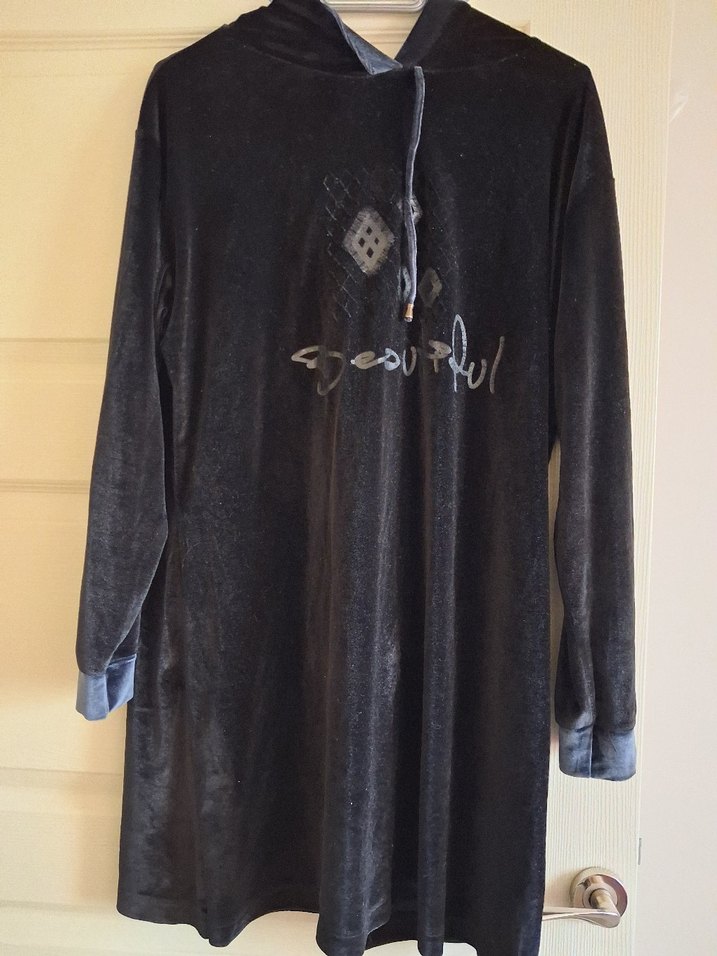 Bu siyah uzun kollu tunik, kapüşonlu ve bol kesimdir, yumuşak kumaştan işlemeli detaylar ve drapeli tasarıma sahiptir. Gotik stil için uygundur.