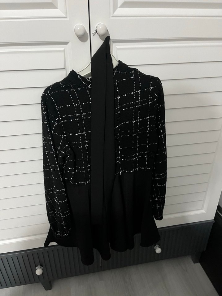 Siyah kareli, uzun kollu kadın bluz, notched lapel yaka ve kemerli bel detayıyla göze çarpar. Sentetik kumaştan yapılmış, günlük kullanım için uygundur.