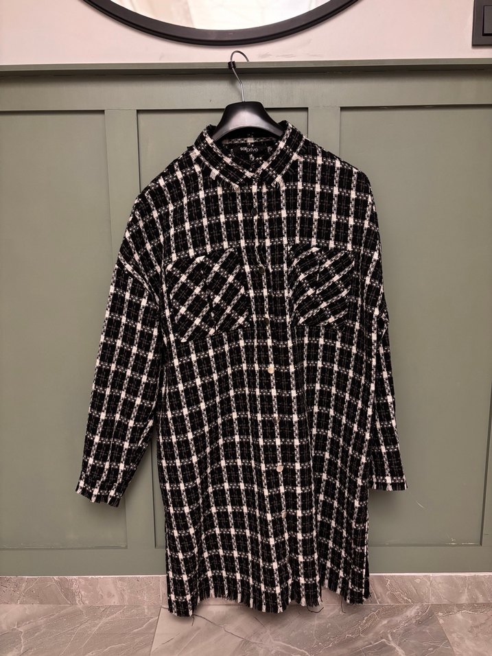 Uzun boylu, bol kesim kadın gömlek, düğmeli ve kesik yakalıdır. Siyah kareli deseniyle günlük sokak stiline uygundur.