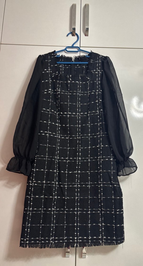Siyah kareli midi elbise, uzun şeffaf kollu ve kesik yaka detaylıdır. Düğmeli ve normal kesim, gotik ve Paris tarzını ofis için birleştirir.