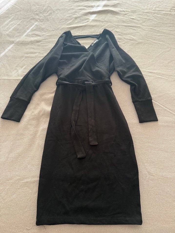Uzun kollu, V yaka ve kemerli siyah triko elbise, ince kesimiyle belinizi vurgular. Düz, yumuşak sentetik kumaştan üretilmiştir. Hiç kullanılmamış