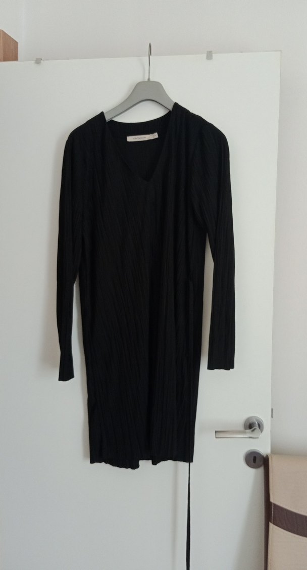 Uzun kollu, V yakalı ve pileli tasarıma sahip siyah uzun elbise. Yumuşak keten kumaştan üretilmiş, bol kesimli ve minimalist normcore stiline uygun. Günlük kullanıma uygun.
