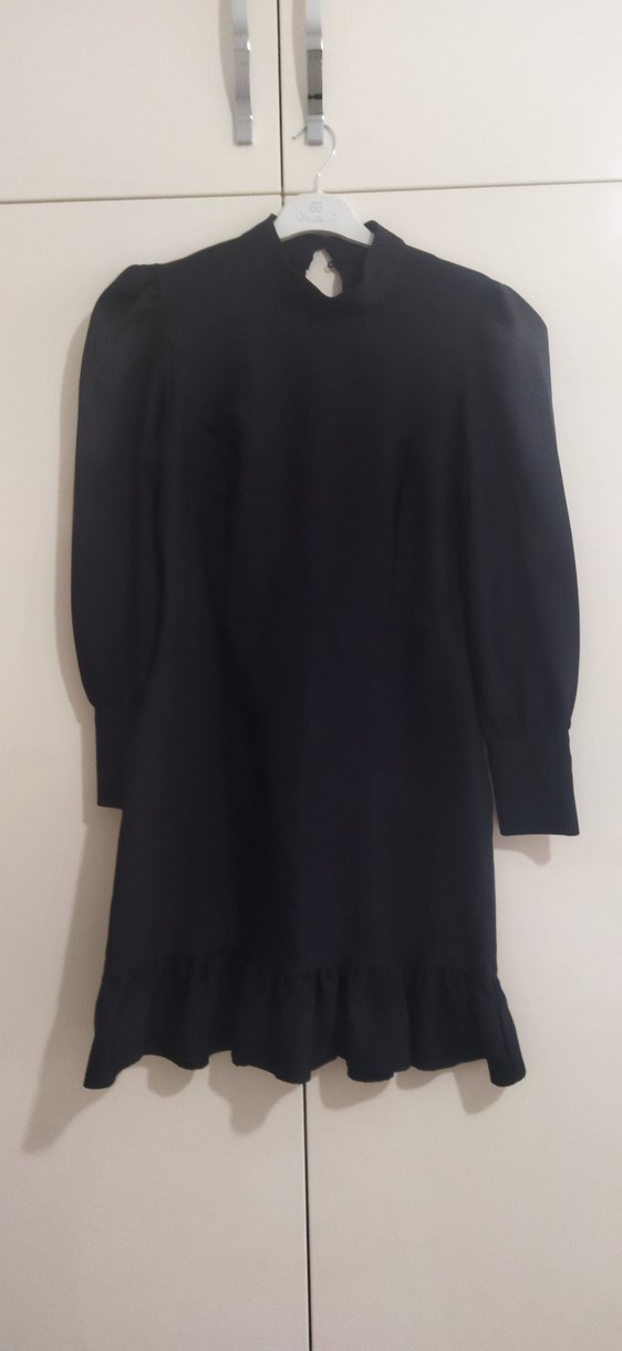 Yüksek yakalı, uzun kollu ve etek ucunda fırfırlı siyah, vücuda oturan midi triko elbisedir. etek ucunda Yumuşak ve sıcak kumaştan, ofis için uygundur.
