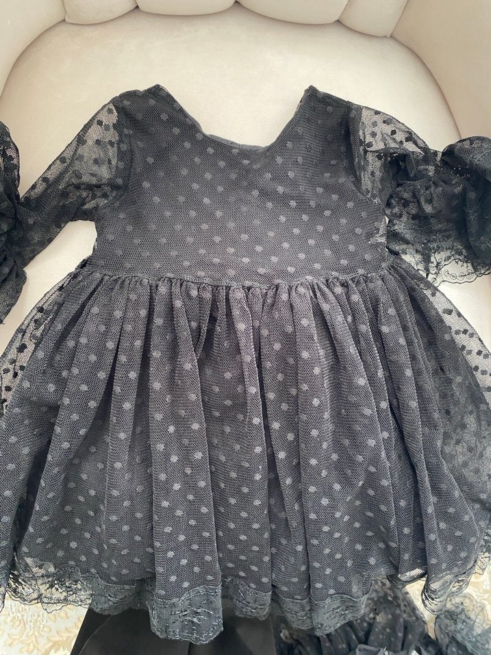 Uzun kollu, gevşek kesim siyah kız çocuk elbisesi, yumuşak sentetik kumaştan üretilmiş ve fırfır detaylara sahip. V yaka ve hafif puantiyeli dokusu bulunur.