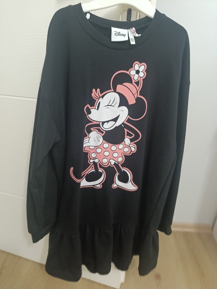 Uzun kollu, bisiklet yaka ve bol kesim siyah kız elbisesi. Ön tarafında Minnie Mouse baskısı ve etek kısmında fırfır detayı bulunur. Yumuşak ve sıcak kumaştan üretilmiştir.