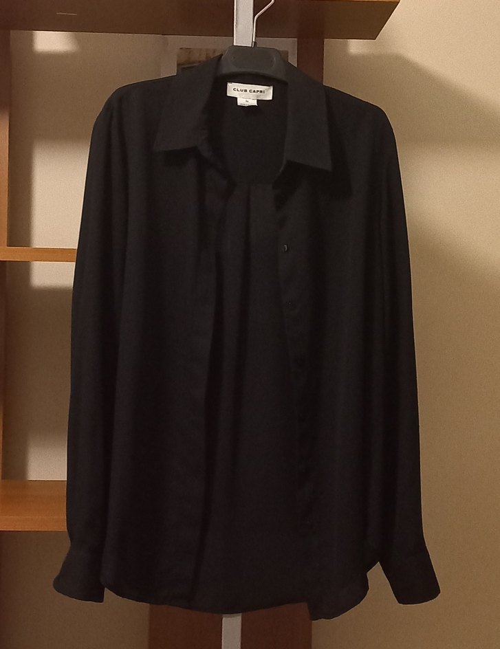 Sadece bir kez giyilmiş, siyah uzun kollu klasik gömlek. 36 beden gömleğin omuzdan omuza uzunluğu 40 cm, koltuk altından koltuk altına 51 cm, enseden etek ucuna 72 cm, ön her parça genişliği 26 cm, omuzdan koltuk altına 21 cm, omuzdan kol ucuna 61 cm kol manşetleri 6 cm ve ön her iki yan parçanın pat genişliği 2,5 cm. Yedek düğmesi bile üzerinde dikili olan gömleğin ön düğmeleri bir pat altında gizli düğme şeklinde. Pat arasında otoğrafta gösterdiğim leke gibi duran birkaç cm'lik iz kesinlikle leke değil. Alan arkadaşımızın gördüğünde ve dokunduğunda da anlayacağı gibi pat arasına yapıştırılmış olan ( ben giyerken çıkardım oradan) incecik bir şeridin yapışkan izi. Gömleği bir daha giymediğim ve zaten pat arasında kaldığı, görülmediği için izi temizleme gereği görmedim. Dediğim gibi, arada kalıyor ve görünmüyor. Her iki etek yanları hafif yuvarlak kavisli olan ve arkada romandan etek ucuna kadar geniş bir pilesi bulunan, erkek yaka olan gömlek çok rahat ve üstte akışkan, güzel duruyor.