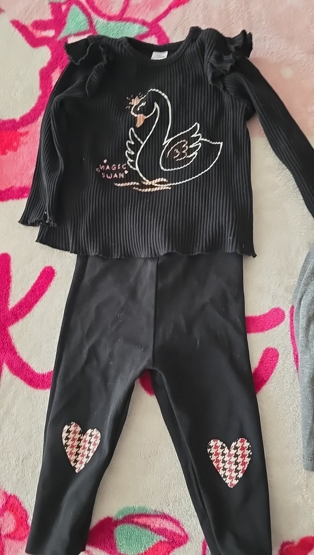 Uzun kollu siyah üstü kuğu nakışlı ve pileli dokulu, dizlerinde kalp desenli siyah pantolon ile kombinlenmiş bebek kız takımı.