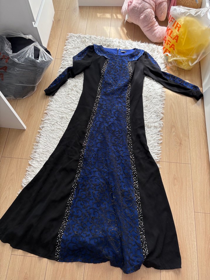 Uzun Kollu Siyah-Mavi Gotik Abiye Elbise
