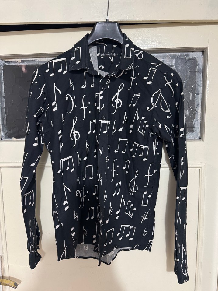 Uzun kollu, yakalı ve düğmeli siyah erkek gömleği, beyaz müzik notası baskılarıyla. İnce kesim ve normal boyda, günlük sokak stili için uygun.