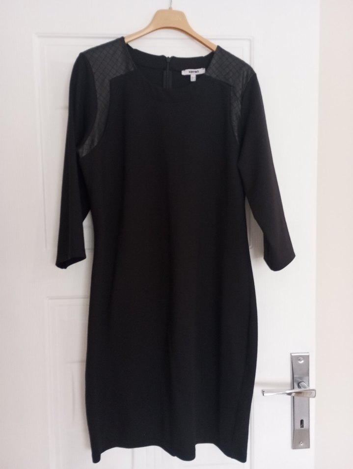 Uzun kollu, kruvaze yakalı, siyah midi elbise, omuzlarda hafif dokulu detaylarla. İş ortamı için şık ve modern bir tercih.